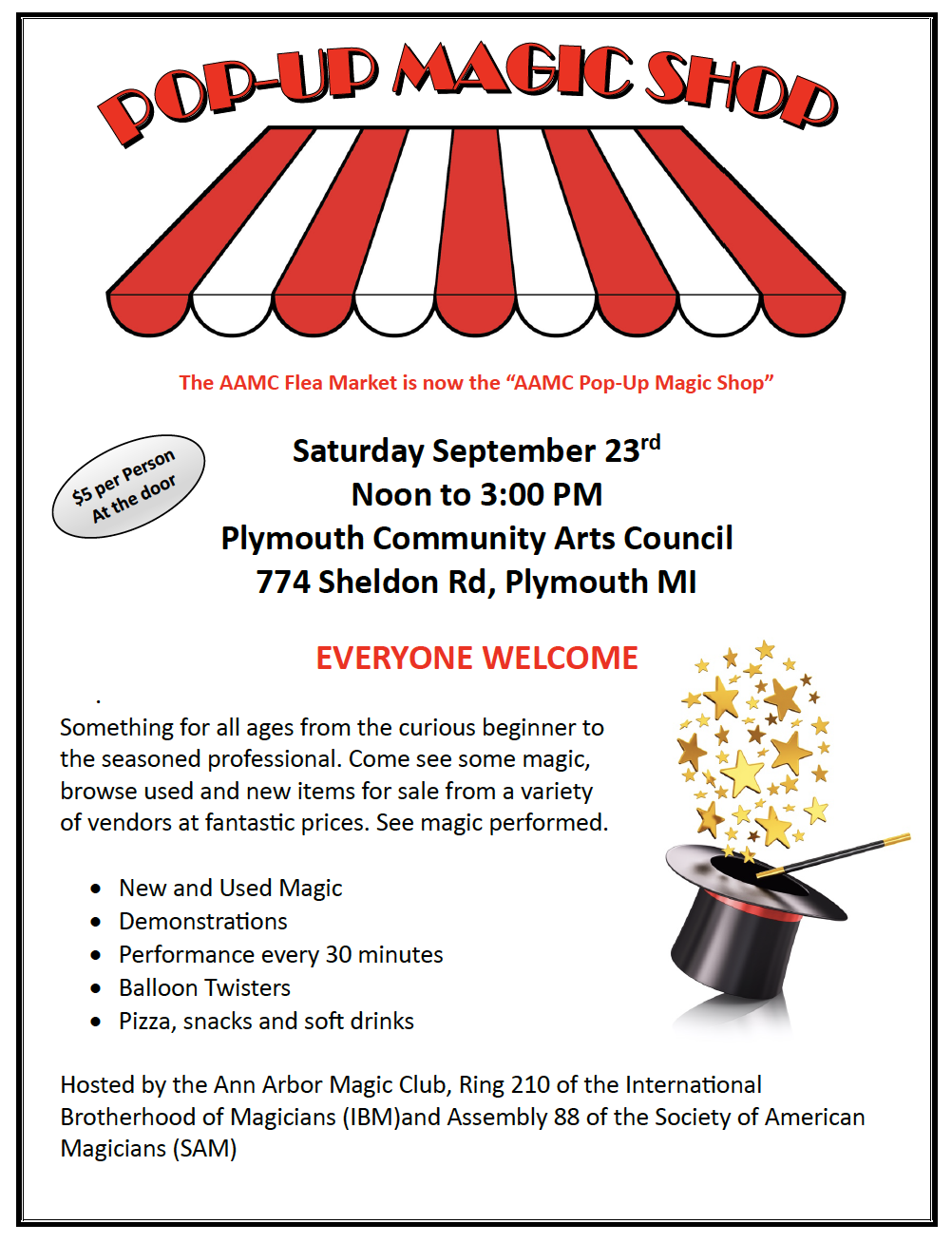 Tables prices are still just $10 for AAMC Members and $20 for non-members. Table rental includes one free admission. You can reserve your table online at our wesite https://aamagic.com (look in the right pane), or contact our Treasurer Rob Krozal in person, by email at rkrozal@yahoo.com or by text or phone at (248) 854-1959.